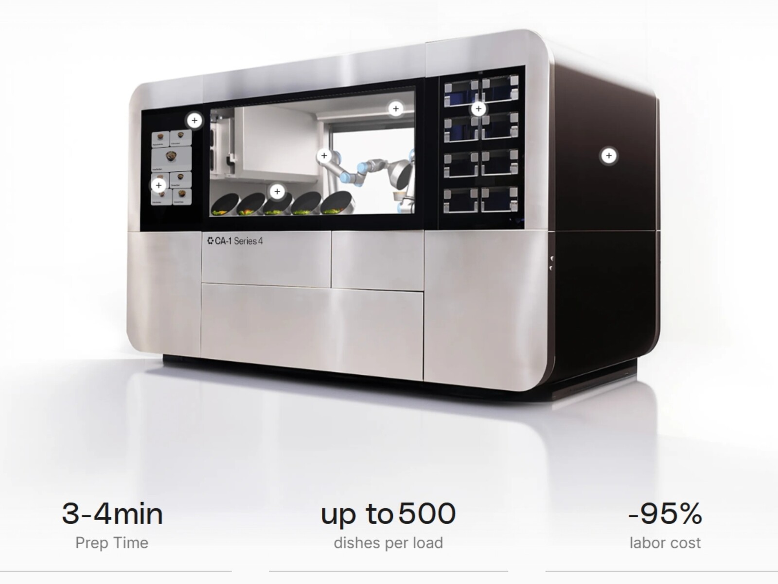 Il CA-1 è una cucina compatta che gestisce l’intero processo in autonomia. Dietro la vetrina trasparente, due bracci robotici preparano i piatti sotto l’occhio vigile di sei telecamere. Il sistema gestisce tutto: