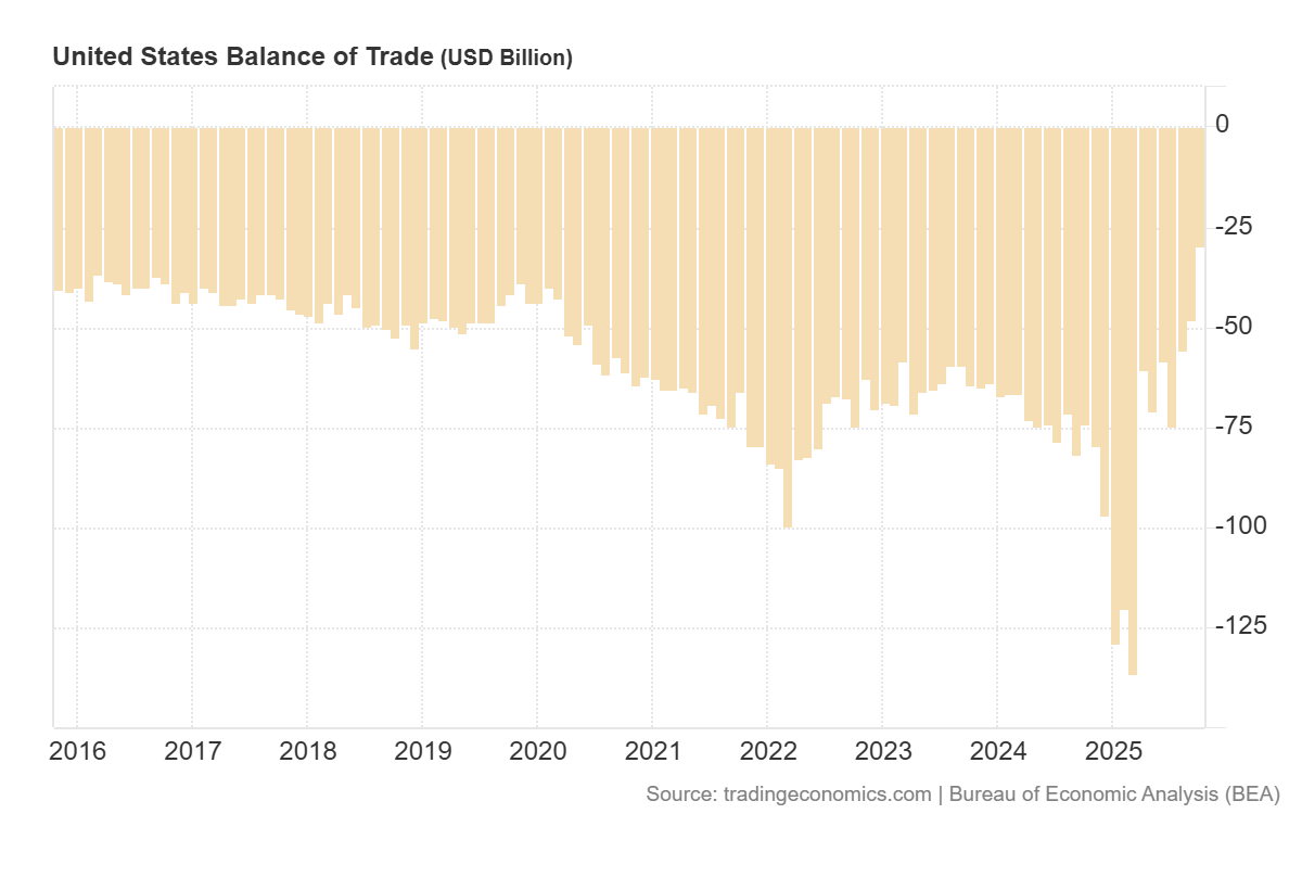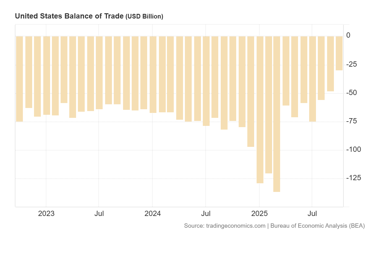 Siamo di fronte a un dato che ha spiazzato il “consensus” degli economisti: le previsioni parlavano di un disavanzo intorno ai 58,1 miliardi, mentre il dato reale ha quasi dimezzato le attese, scendendo nettamente rispetto ai 48,1 miliardi (rivisti) di settembre. Evidentemente, l’implementazione dei dazi e le nuove politiche commerciali stanno generando oscillazioni significative nei flussi, modificando la struttura stessa dell’import-export a stelle e strisce.