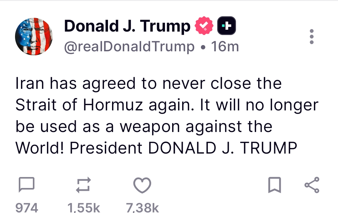 Prima di tutto l‘Iran ha ufficialmente affermato che lo stretto di Hormuz sarebbe aperto attraverso la rotta iraniana. La notizia è stata ripresa da Donald Trump nel proprio social Truth, il che gli dà un peso bipartian: