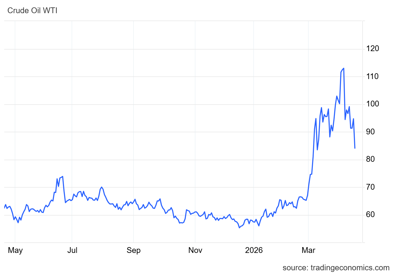 Dal punto di vista macroeconomico, questo scenario è la classica manna dal cielo per un’Europa produttiva in affanno. Ecco l’andamento del petrolio WTI: