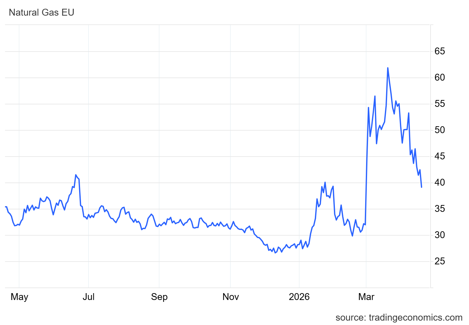 Qui abbiamo invece il gas nel mercato europeo TTF: