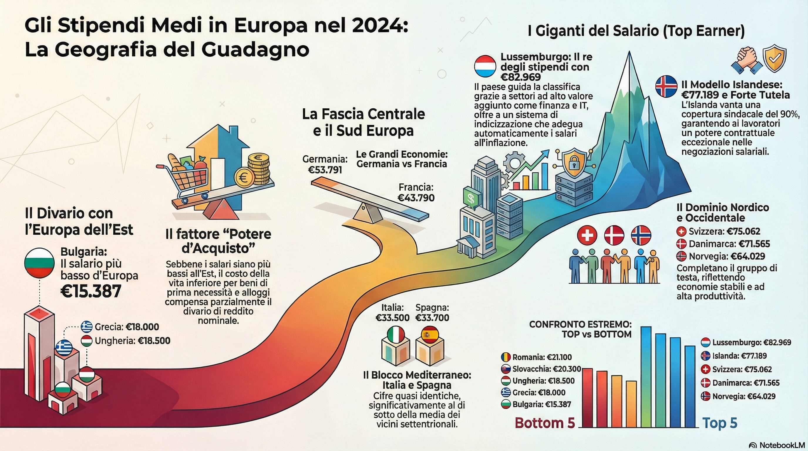 - Lussemburgo (€82.969): Oltre alla finanza, il Granducato adotta un sistema di indicizzazione automatica dei salari all’inflazione. Una misura squisitamente keynesiana che difende il potere d’acquisto reale dei lavoratori.