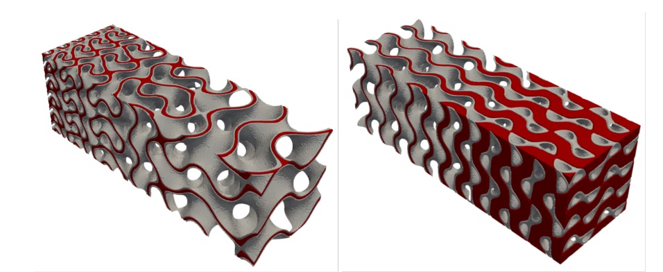 Il nuovo design, denominato INFLUX (Intertwined Nuclear Fuel Lattice for Uprated heat eXchange), abbandona il cilindro per abbracciare una struttura a reticolo complessa, simile a una spugna o a un’elica continua. Questa forma è una TPMS: una superficie che curva e si avvita continuamente, creando canali intrecciati che non si mescolano mai.