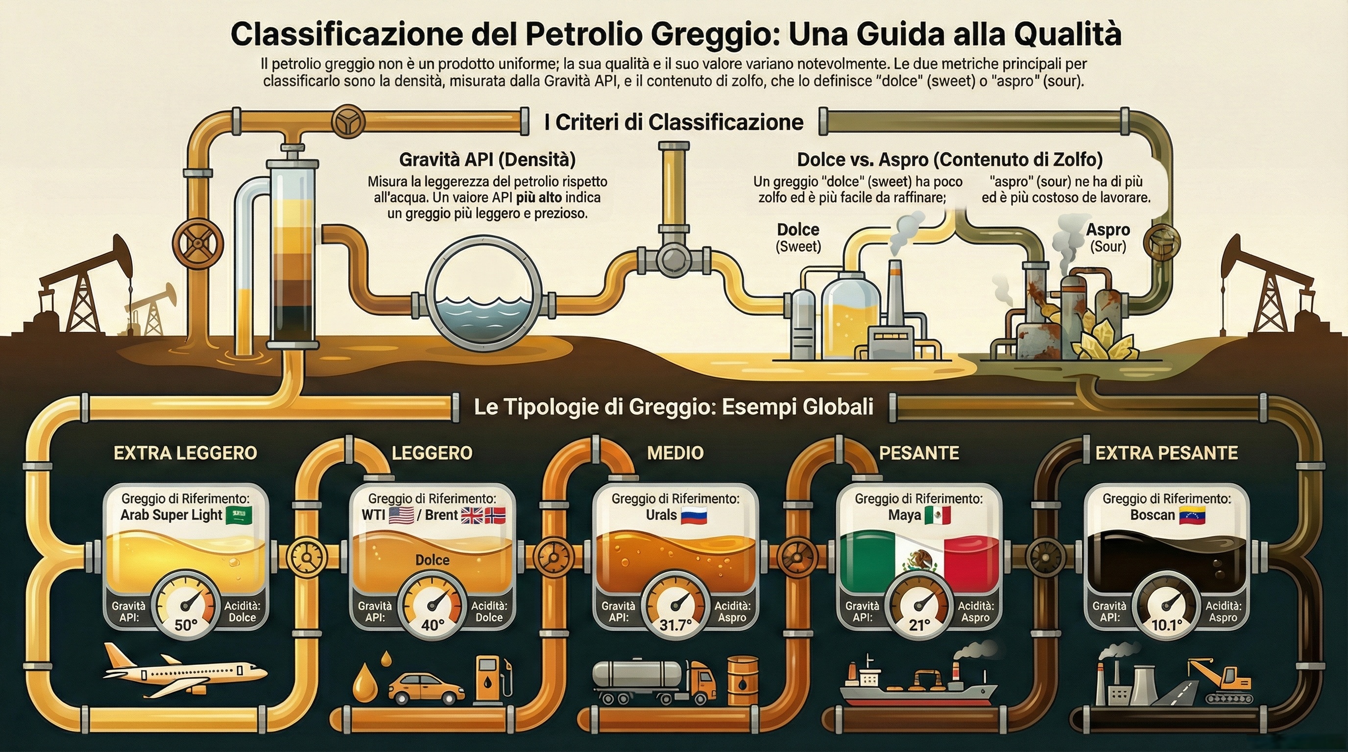- Lo Zolfo (Sweet vs Sour): A destra, il grafico mostra la distinzione tra greggio “dolce” (poco zolfo) e “aspro” o “acido” (molto zolfo). Il greggio acido è corrosivo, tossico e richiede processi costosi per rimuovere le impurità prima di diventare utilizzabile.