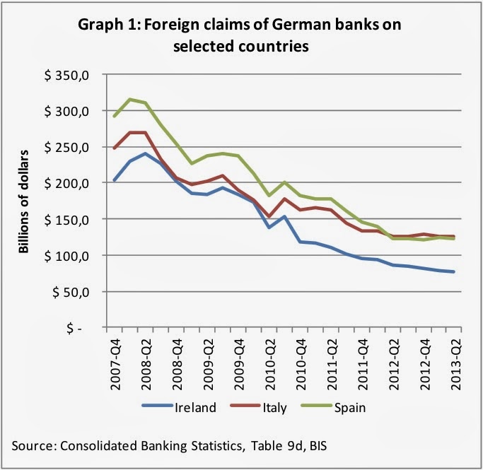 La prima indicazione che il peggio era ormai passato, è probabilmente stata il fatto che la Deutsche Bank non ha partecipato alla seconda operazione LTRO del febbraio 2012. Nel secondo trimestre del 2012, cioè il trimestre precedente all’annuncio di Draghi del programma OMT, i crediti delle banche tedesche nei confronti dei debitori spagnoli e italiani hanno toccato il minimo, e la tendenza al ribasso per quanto riguarda i crediti nei confronti dei mutuatari irlandesi è rallentata. Le banche tedesche hanno anche ottenuto tempo per l’attuazione dell’Unione bancaria e le sue diverse componenti. Qualunque siano i problemi che possono avere ora le banche tedesche, la loro esposizione verso i paesi europei in difficoltà non è ormai un problema importante, e forse non è affatto un problema. Ed esse non hanno alcun bisogno di fare prestiti a queste economie problematiche: hanno da alimentare un mercato immobiliare interno in pieno boom.