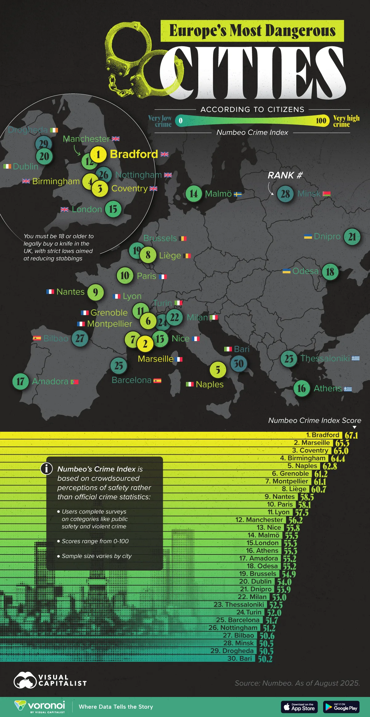 Secondo la classifica di metà 2025, le cinque città più pericolose d’Europa sono Bradford, Marsiglia, Coventry, Birmingham e Napoli. Ecco l’infografica dal sito: