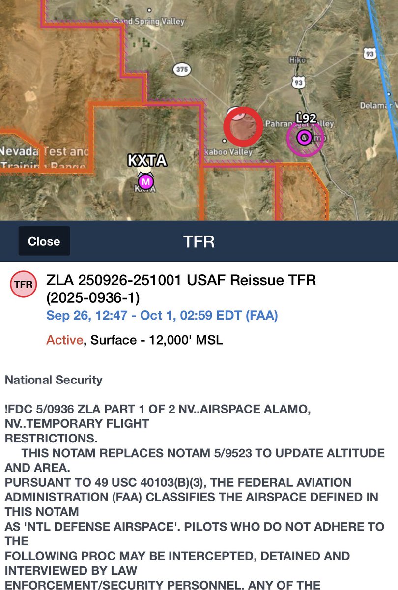 Andiamo con ordine. Il 23 settembre 2025, un velivolo dell’aeronautica militare statunitense, appartenente al 432° Stormo (Wing) di stanza presso la Creech Air Force Base, è precipitato. Fortunatamente, l’incidente non ha causato vittime né feriti. Le autorità hanno immediatamente istituito una restrizione di volo temporanea (TFR) per motivi di “sicurezza nazionale” su un’area di circa 12 miglia a est del confine dell’Area 51, mentre le operazioni di recupero e bonifica si sono concluse il 27 settembre.