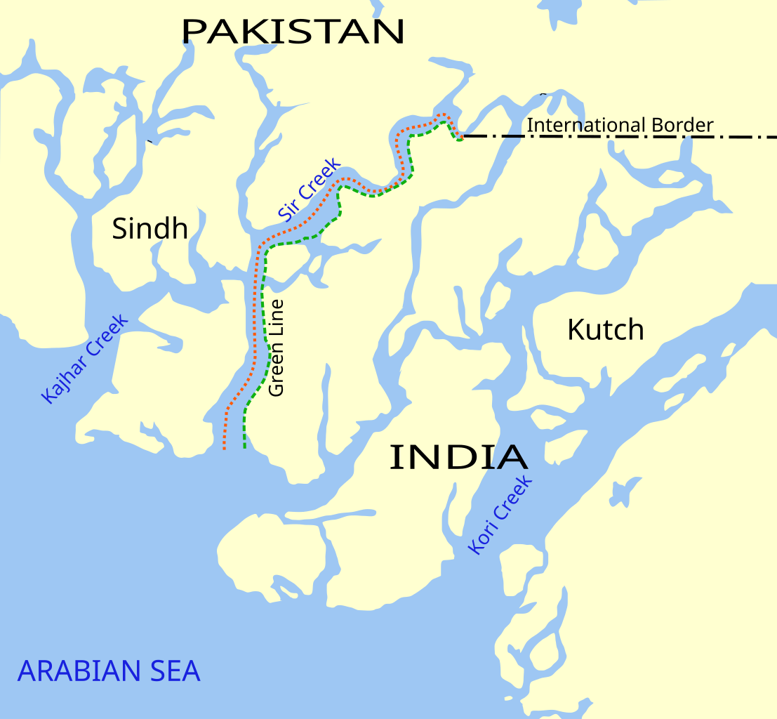 Sir Creek è un estuario tidale di 96 km che segna il confine tra lo stato indiano del Gujarat e la provincia pakistana del Sindh. A differenza del resto del confine internazionale, questa striscia di terra e acqua non è mai stata formalmente demarcata. Il confine definito si ferma al cippo di confine n. 1175 nel Rann of Kutch; a sud di quel punto inizia l’area contesa di Sir Creek, che si estende fino al Mar Arabico.