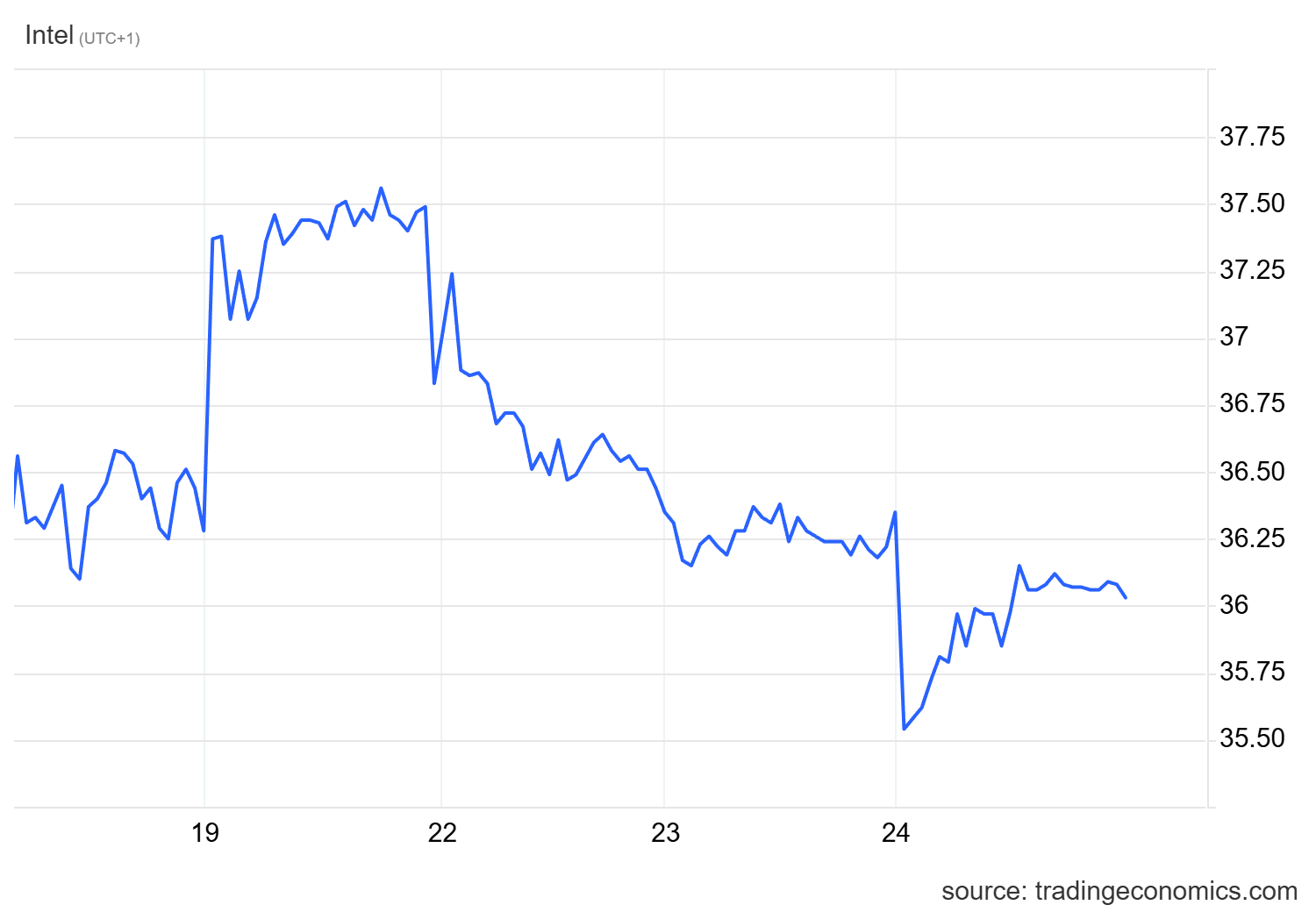 Il titolo INTC ha reagito a queste notizie con un calo del 4%, scendendo di quasi il 20% dai massimi recenti. Ecco il relativo grafico: