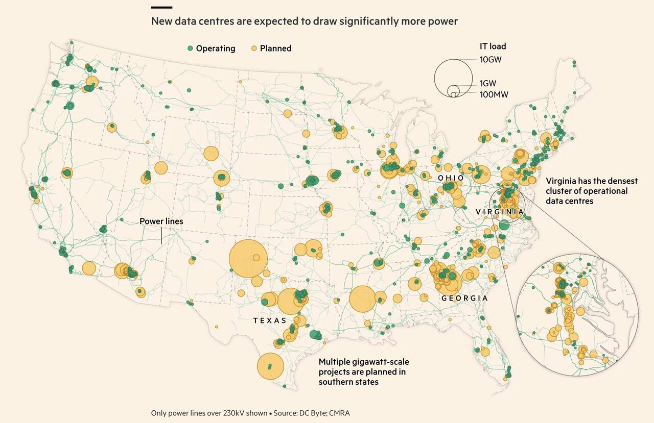 - La geografia dell’IA: I carichi di lavoro per l'”inferenza” dell’IA (l’utilizzo pratico dei modelli da parte degli utenti finali) richiedono la vicinanza geografica ai consumatori per ridurre i tempi di latenza, andando a sovraccaricare reti elettriche in aree urbane già congestionate. Al contrario, l’addestramento dei modelli di IA può essere svolto ovunque, spingendo le aziende a migrare verso aree remote dove l’energia è ancora abbondante.