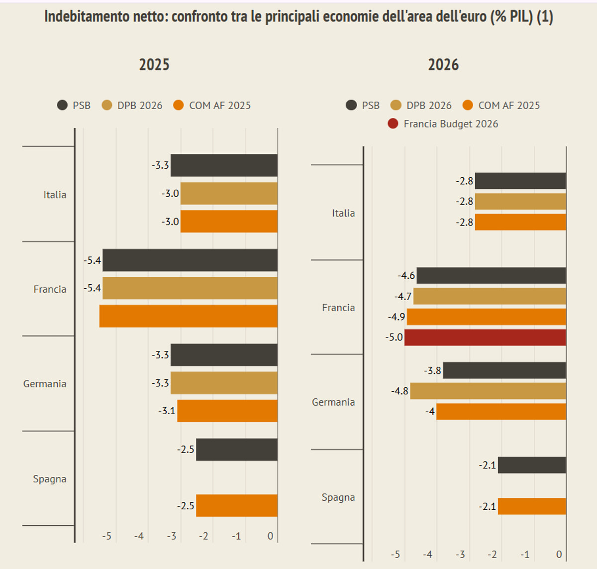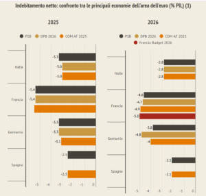 Nel 2025 sette Paesi dell’area dell’euro indicano nei loro documenti programmatici di bilancio un disavanzo superiore al 3% del Pil. Vale a dire un rapporto tra deficit (cioè la differenza tra entrate e uscite) e prodotto interno lordo superiore alla soglia fissata dai parametri di Maastricht per valutare lo stato di salute delle singole economie nazionali. Il primato del deficit spetta invece alla Francia che stima un disavanzo del 5,4 per cento, in lieve miglioramento rispetto al 5,8% fatto registrare nel 2024. La riduzione del deficit, informa il documento, si deve in particolare a “un ampio pacchetto di misure di contenimento della spesa e interventi temporanei sul lato delle entrate”.