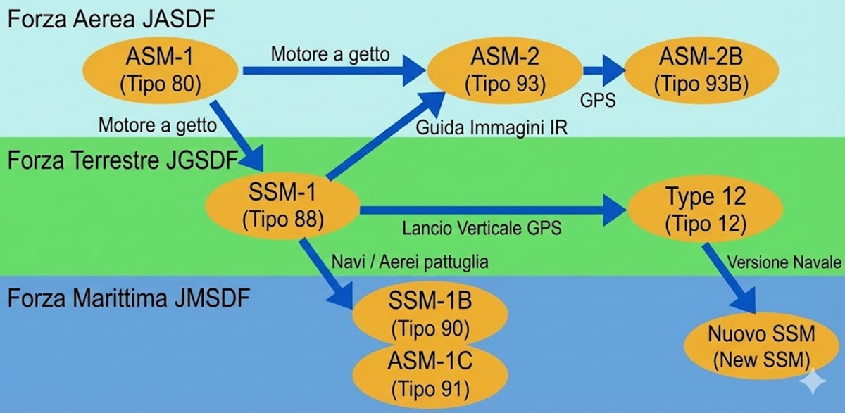 - Le origini (JASDF): Si parte dall’ASM-1 (Type 80), un missile aria-nave con motore allo stato solido, per passare all’ASM-2 (Type 93) con guida a immagini a infrarossi e propulsione a getto, fino alle varianti GPS.