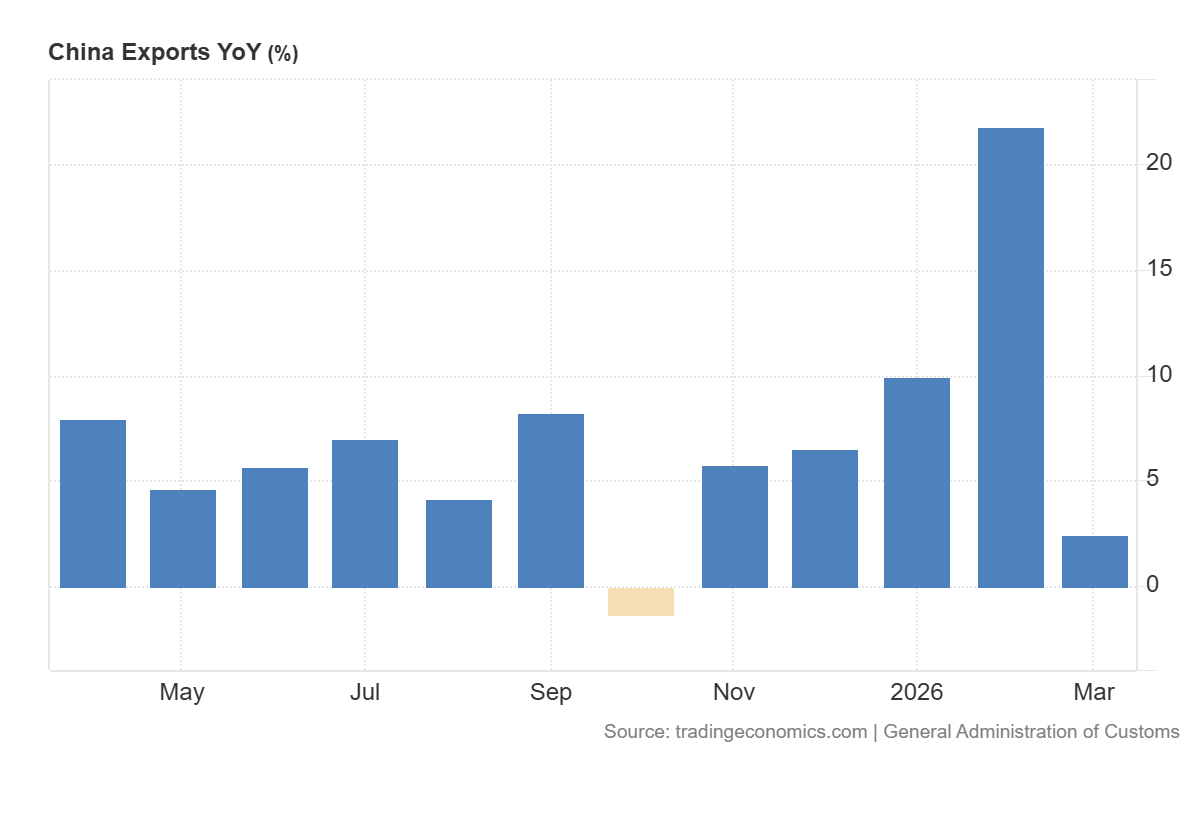 Dopo un inizio d’anno scoppiettante, con un balzo delle esportazioni del 21,8% nel bimestre gennaio-febbraio, marzo ha tirato il freno a mano. Le esportazioni cinesi sono cresciute solo del 2,5% su base annua, fermandosi a 321,03 miliardi di dollari. Un dato che ha gelato i mercati, i quali scommettevano su un solido +8,3%. Ecco il grafico, da Tradingeconomics: