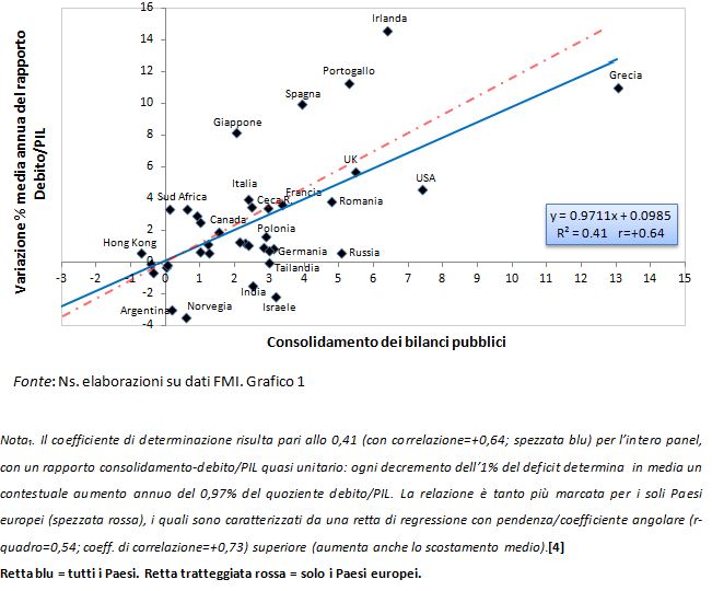Poiché la retta di regressione è inclinata verso l’alto, un maggiore consolidamento determina in media un incremento del rapporto debito/Pil e per i paesi europei tale relazione risulta più marcata (vedi spezzata rossa) cioè il consolidamento dei bilanci pubblici comporta mediamente effetti negativi maggiori.