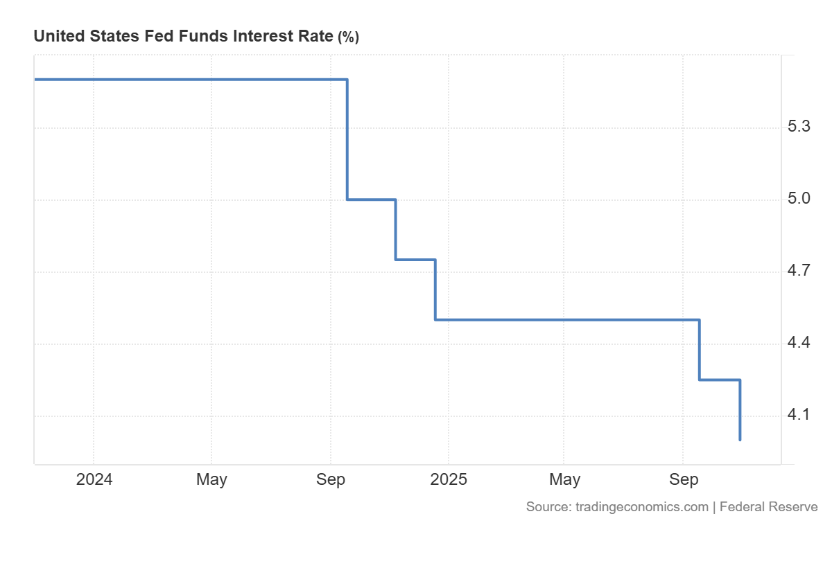 I policymaker del FOMC (il comitato di politica monetaria) hanno votato per abbassare il tasso di riferimento dei federal funds di 25 punti base, portandolo in un nuovo intervallo compreso tra il 3,75% e il 4,00%. Questo fa seguito a un taglio identico avvenuto a settembre, che era stato il primo di quest’anno.
