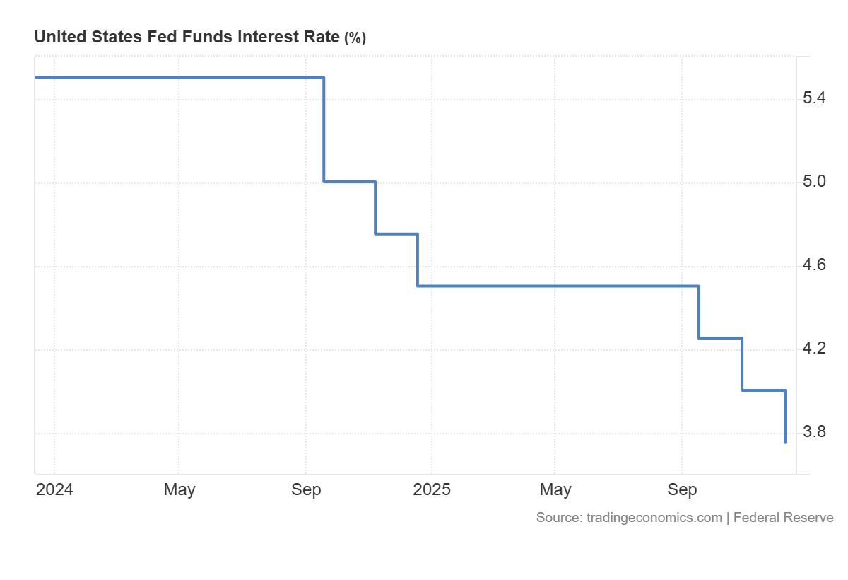Si tratta di una mossa che porta il costo del denaro ai livelli più bassi dal 2022, ma chi si aspettava una discesa rapida e indolore verso tassi più bassi dovrà ricredersi. Quello a cui abbiamo assistito è un classico “Taglio del Falco”: la Fed ti dà lo zuccherino oggi, ma ti avverte che la dieta sarà ferrea per tutto il prossimo anno. Ecco comunque il grafico del tasso di riferimento della Fed:
