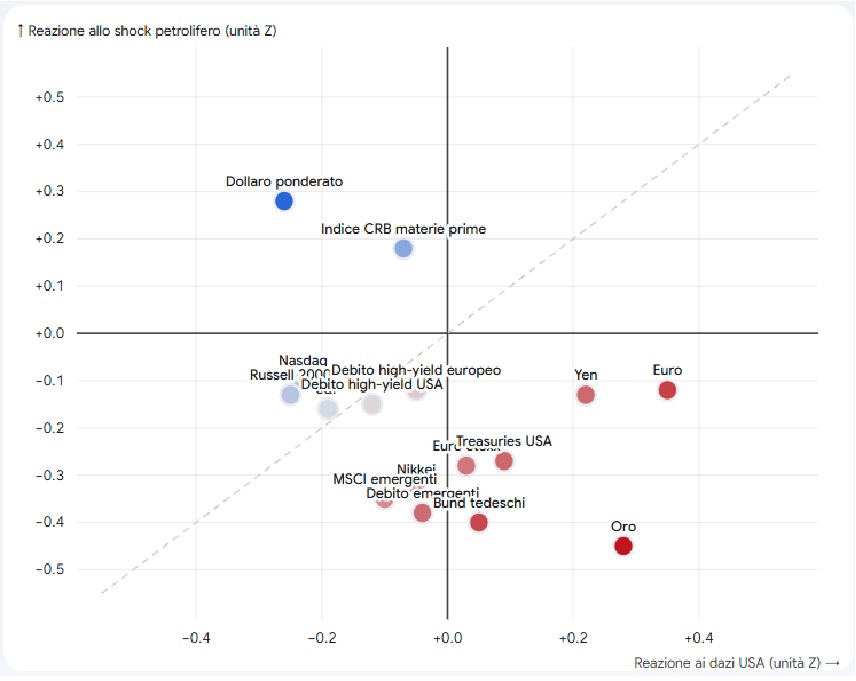 Ecco comunque il grafico in cui si mostra l’interazione delle varie asset alle due crisi: sulla X quella petrolifera sulle Y quella dei dazi. Il quadrante che vede una reazione positiva ad entrame le crisi è vuoto, in modo disastroso: