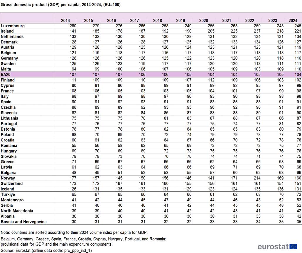 Se poniamo la media dell’Unione Europea a quota 100, la classifica della ricchezza pro capite offre una fotografia impietosa degli attuali equilibri di forza: