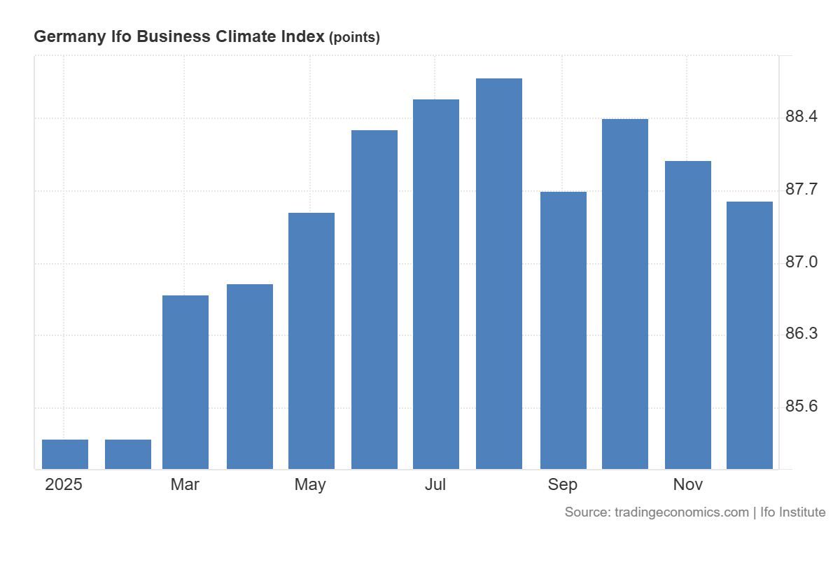 Se qualcuno sperava in un miracolo di fine anno per l’economia tedesca, dovrà ricredersi. Il sentimento tra le aziende in Germania si è deteriorato ancora una volta, chiudendo il 2025 con un tono decisamente cupo.1 L’indice Ifo Business Climate è sceso a 87,6 punti a dicembre, in calo rispetto agli 88,0 punti di novembre (rivisto al ribasso).2 Si tratta del livello più basso degli ultimi sette mesi, un dato che smentisce le già timide previsioni che puntavano a un 88,2.