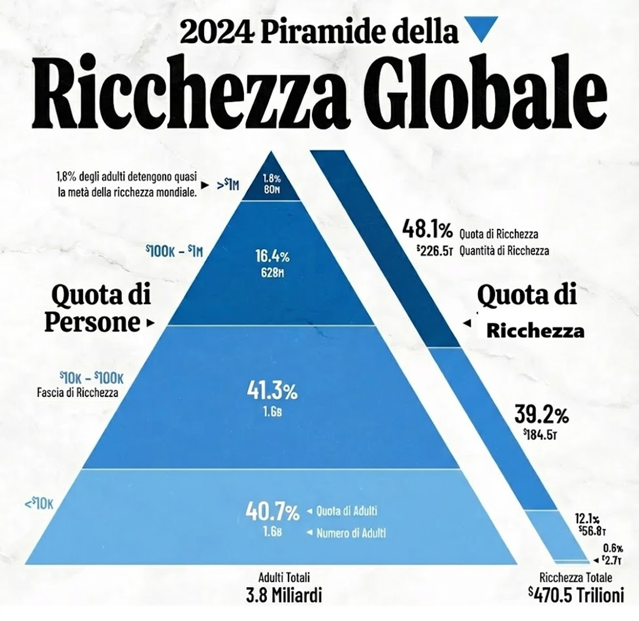Al vertice della piramide finanziaria globale siede una ristretta élite che detiene quasi la metà degli asset mondiali, mentre miliardi di persone, confinate nei gradini più bassi, si devono accontentare di quelle che, statisticamente, appaiono come briciole. Analizziamo la situazione basandoci sull’ultimo Global Wealth Report di UBS, che scompone questa piramide per numero di individui e per la quota di ricchezza effettivamente controllata.