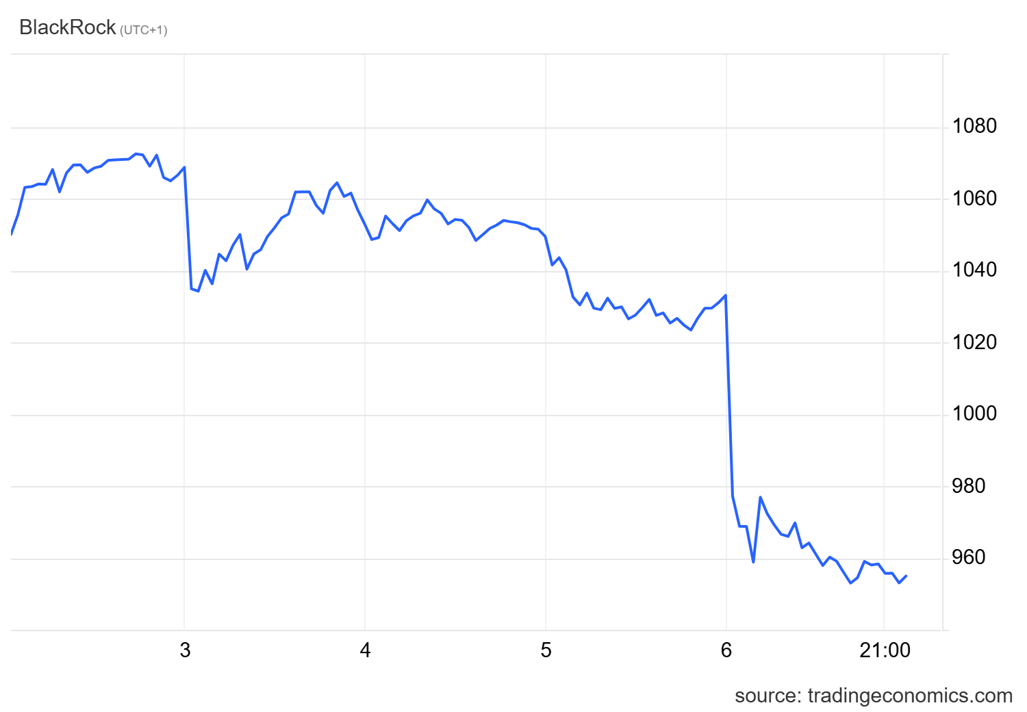 Venerdì le azioni di BlackRock, il più grande gestore patrimoniale al mondo, sono crollate del 6,7% alla Borsa di New York. Un tonfo inserito in un più ampio selloff di mercato, innescato dai timori geopolitici e dai pessimi dati sul lavoro americano, ma che ha il suo epicentro in una decisione drastica: la società ha limitato i prelievi dal suo fiore all’occhiello, l’HPS Corporate Lending Fund (HLEND), un fondo di credito privato da 26 miliardi di dollari. Ecco la quotazione di Blackrock da Tradingeconomics: