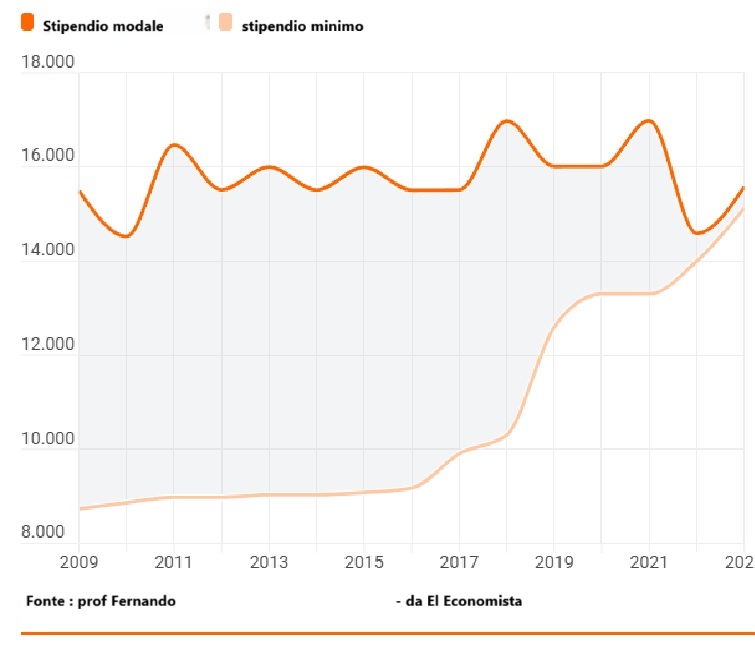 • 2023: Salario minimo 15.120 €; Salario modale 15.575 € (Divario: 3%)