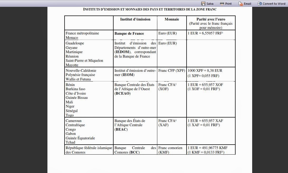 la centralizzazione delle riserve di cambioIn cambio della garanzia del tesoro francese (pagatore di ultima istanza, ma guarda un po, NDR) le tre banche centrali sono tenute a depositare una parte delle loro riserve di cambio su un conto detto di operazioni aperta in uno dei libri del Tesoro (capite di che cosa si nutre ancora lo stato esagonale?).
