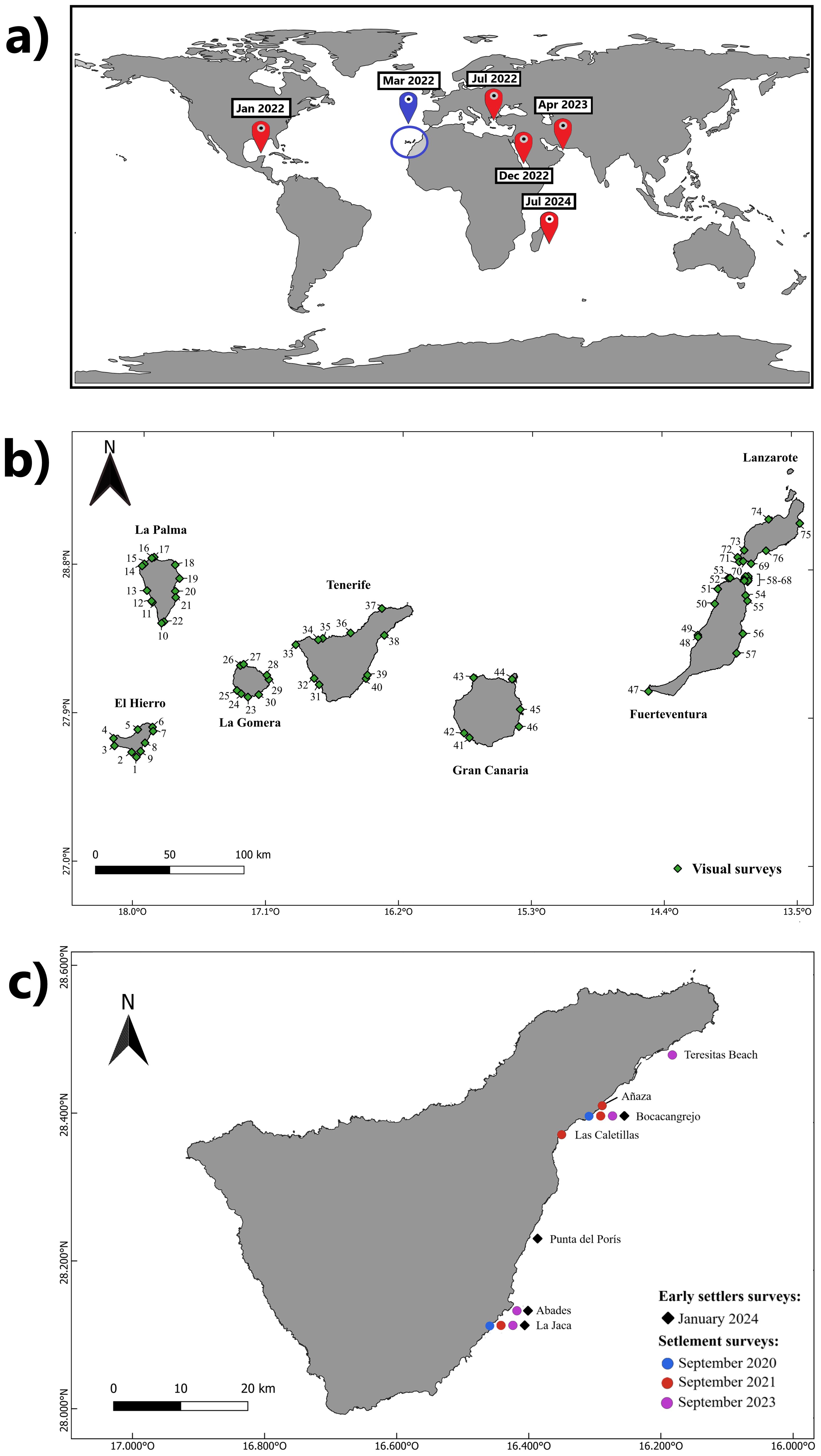 Mappa (a) della diffusione globale delle morie di massa di diadematidi dal 2022. In blu, la posizione delle morie nell’arcipelago delle Canarie, in rosso gli eventi di moria di massa segnalati in precedenza, (b) le Isole Canarie con l’indicazione dei luoghi in cui sono state condotte le indagini visive e (c) l’isola di Tenerife con l’indicazione dei luoghi e delle date in cui sono state condotte le indagini sull’insediamento e il reclutamento.