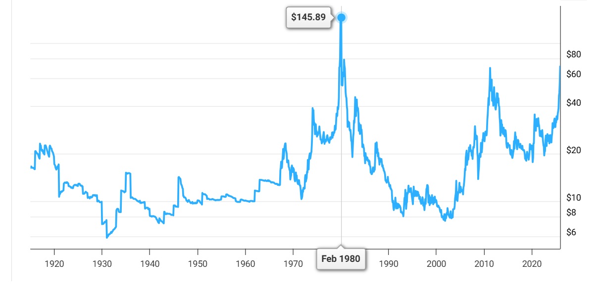 Tra il 1979 e il 1980, al culmine di un periodo di altissima inflazione e in uscita da una severa crisi energetica globale, l’argento toccò un picco nominale intorno ai 40 dollari. Era la fine dell’amministrazione Carter negli Stati Uniti, un’epoca caratterizzata dalla stagflazione e dal celebre tentativo dei fratelli Hunt di monopolizzare il mercato di questo metallo.