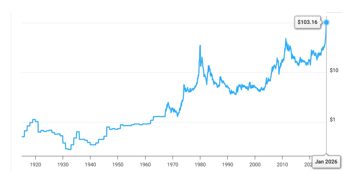 Ecco il grafico sui prezzi dell’argento storici degli ultimi 100 anni, da Macrotrends:
