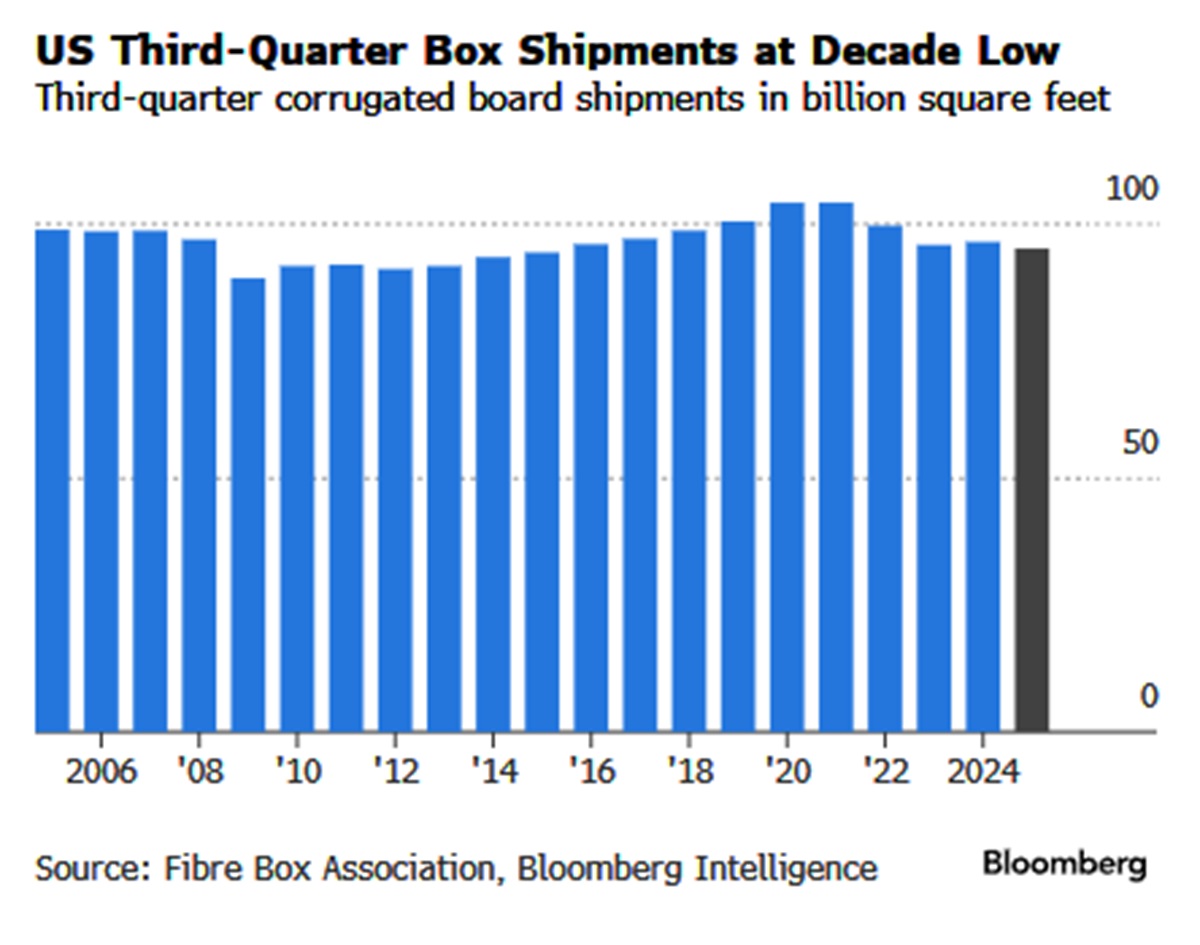 Il quadro economico generale è, per usare un eufemismo, nuvoloso. Bloomberg Intelligence ha sottolineato che gli ordini di scatole a ottobre sono rimasti piatti o inferiori al normale. Questo dato si sposa perfettamente con altri segnali preoccupanti: