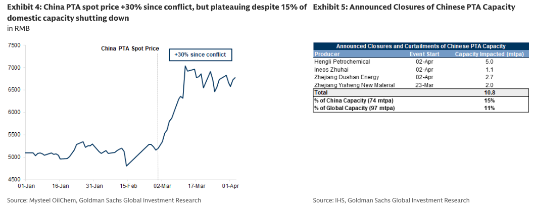 Per l’abbigliamento e i tessuti, dove gli input legati al petrolchimico rappresentano dal 50% al 65% del costo dei beni venduti (COGS), gli ultimi movimenti dei prezzi spot implicano uno shock dei costi del 17%. Si tratta di un valore sufficiente per costringere gli impianti meno efficienti alla chiusura.