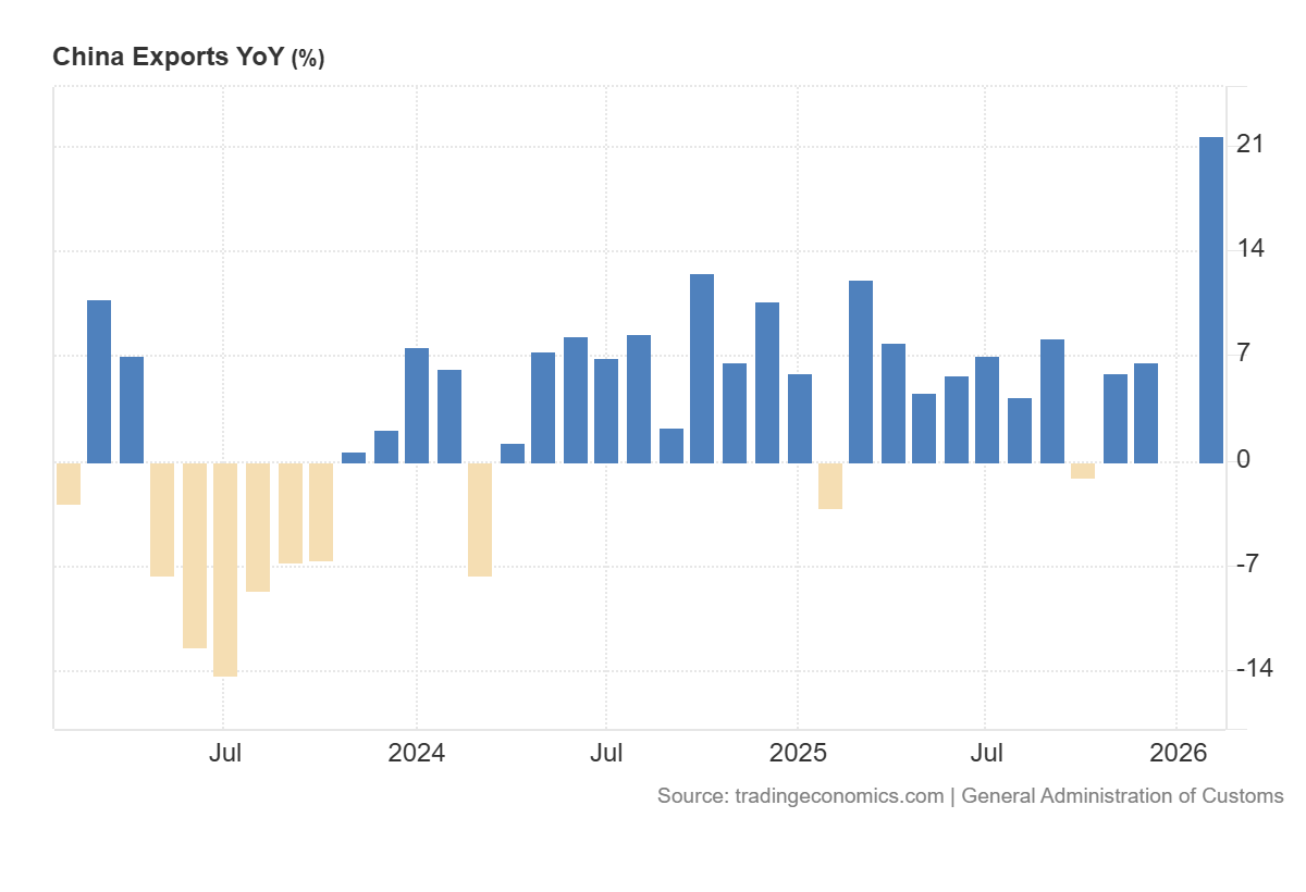 Partiamo da Pechino. I dati del primo bimestre 2026 hanno letteralmente demolito le timide previsioni degli analisti. Mentre in molti si attendevano un modesto +7,1%, le esportazioni della Cina sono balzate del 21,8% su base annua, raggiungendo la mostruosa cifra di 656,58 miliardi di dollari. Si tratta della crescita più rapida dall’ottobre del 2021 e mostra come la Cina stia scaricando potentemente all’estero le proprie produzioni. Ecco il grafico relativo da Tradingeconomics: