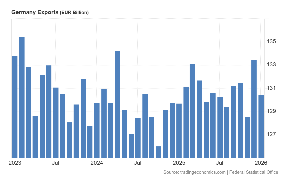 I dati di gennaio 2026 certificano un brusco calo dell’export della Germania del 2,3% su base mensile, fermandosi a 130,5 miliardi di euro. Un tonfo che fa peggio delle già negative stime di mercato (che si attendevano un -2%) e che inverte la rotta rispetto all’illusorio rimbalzo di dicembre. Ecco il grafico relativo da Tradingeconomics: