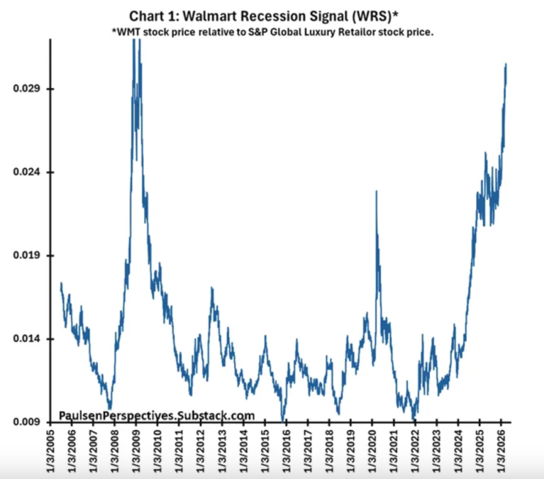 Di cosa si tratta, ma soprattutto perché dovrebbe preoccuparci? Stiamo parlando del Walmart Recession Signal (WRS), o “Indicatore economico di Walmart”. Creato nel 2024 da Jim Paulsen, analista veterano in pensione di Wells Fargo Asset Management, questo strumento è stato concepito per misurare il rischio reale di recessione negli Stati Uniti basandosi non sui grandi aggregati finanziari, ma sui consumi di base.