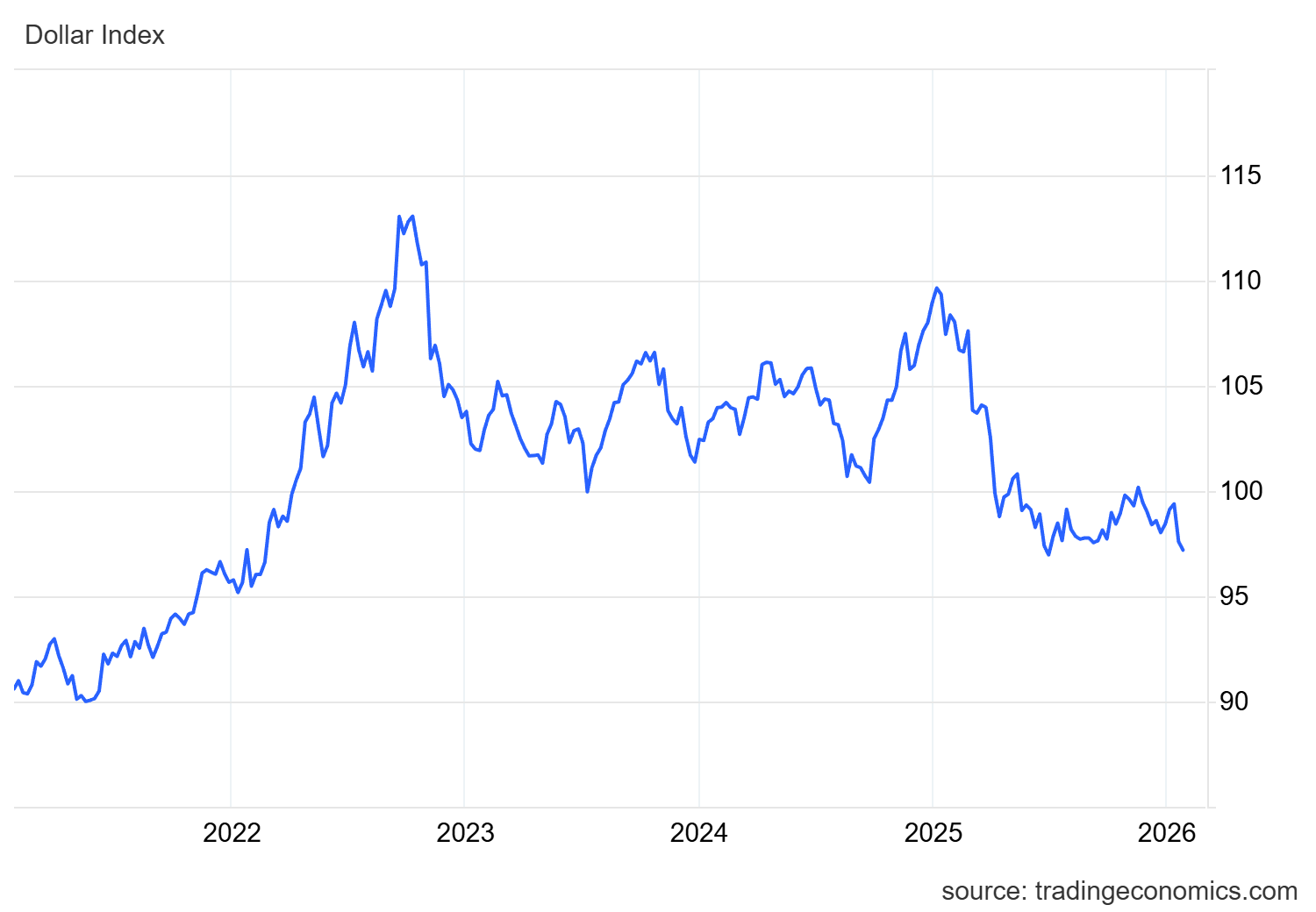 Mentre l’oro brilla, il biglietto verde sbiadisce. Il Dollaro ha vissuto la sua settimana peggiore dal maggio 2025, confermando la correlazione inversa da manuale: quando la fiducia nella valuta di riserva vacilla, l’oro decolla. Nel 2025 il dollaro ha perso il 9,5% contro un paniere di valute globali, il calo più ripido dal 2017.