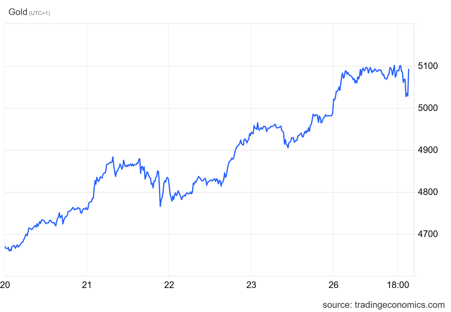 Non è più solo una tendenza, è una fuga vera e propria verso la sicurezza. Il metallo giallo ha deciso di riscrivere la storia finanziaria proprio all’inizio di questo 2026, sfondando per la prima volta la barriera psicologica e tecnica dei 5.000 dollari per oncia troy (circa 4.217 euro). Ecco dal sito Tradingeconomics il la quotazione odierna del metallo prezioso: