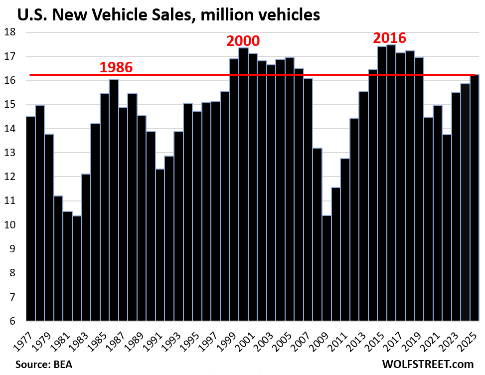 Se guardiamo i numeri freddi e crudi, le vendite di veicoli nuovi negli Stati Uniti nel 2025 sono salite del 2,4% a 16,2 milioni di unità. Sembra una buona notizia, il dato più alto dal 2019. Tuttavia, se grattiamo via la patina superficiale, scopriamo una realtà ben più amara: siamo appena sopra i livelli del 1986. Avete letto bene. Quattro decenni di stagnazione strutturale, crolli vertiginosi e riprese parziali, il tutto mentre la popolazione americana è cresciuta del 21% negli ultimi 25 anni.