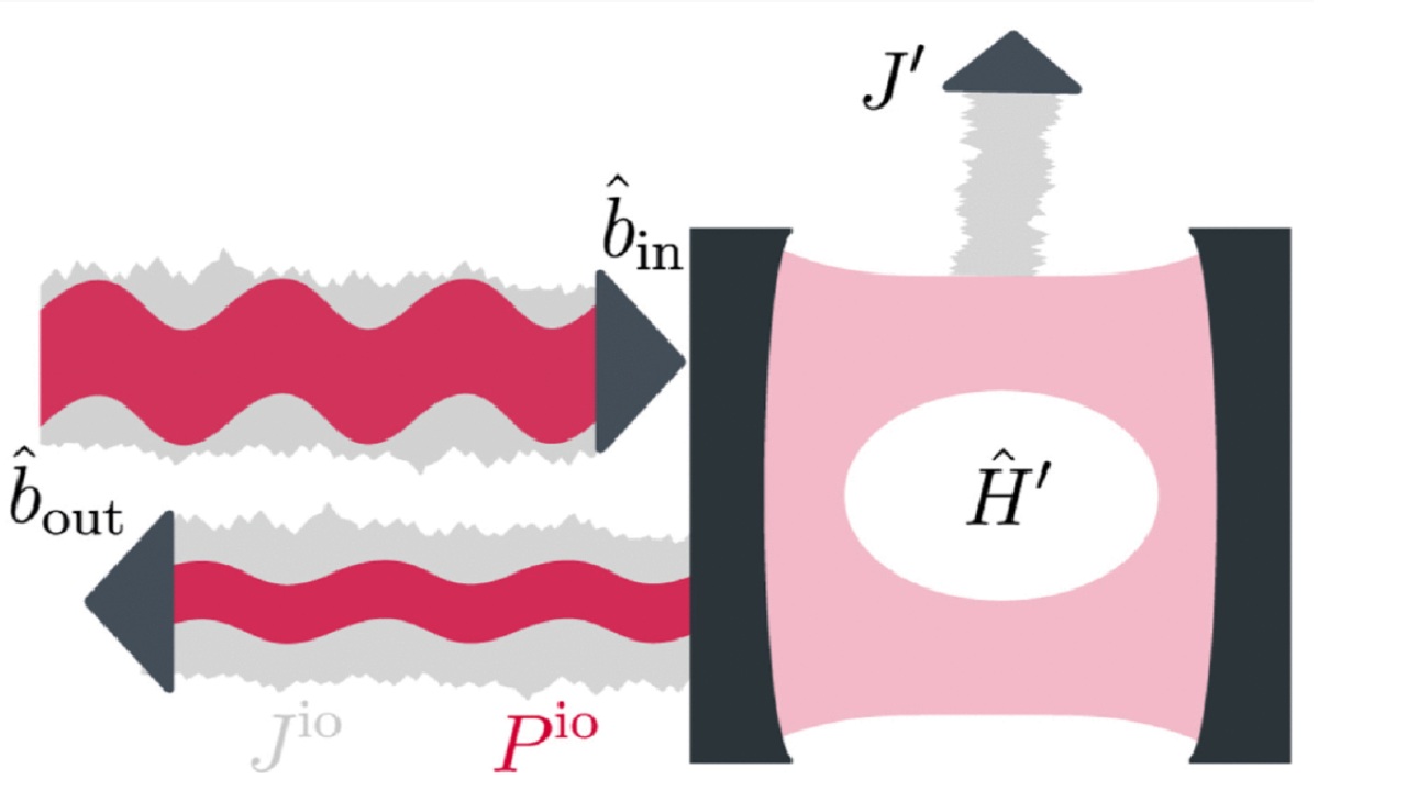 Configurazione ì dell’esperimento. Una cavità con un sistema quantistico incorporato, governato dall’Hamiltoniano ^𝐻′, è guidata dal campo di ingresso, che contiene una parte coerente, data dalla media del campo di ingresso ⟨^𝑏in⟩, nonché fluttuazioni termiche. Rispetto all’ingresso, il campo di uscita, ^𝑏out, ha tipicamente una parte coerente più piccola e fluttuazioni maggiori. Il lavoro ( 𝑃io) e il calore ( 𝐽io) sono dati rispettivamente dalle variazioni della parte coerente e delle fluttuazioni. Il calore dissipato dal sistema intracavità è dato da 𝐽′.