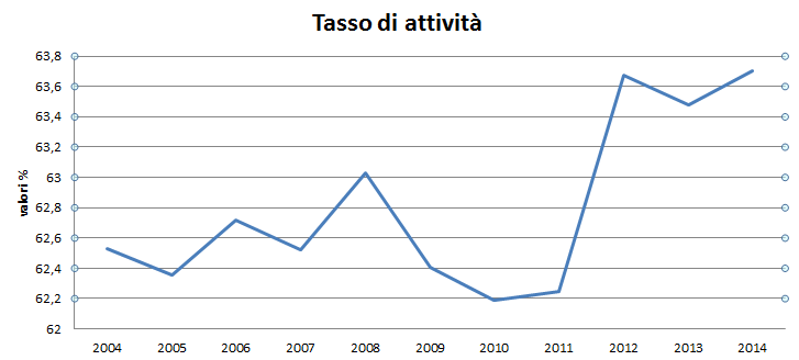 Infatti, nel grafico che segue, che rappresenta il tasso di attività (cioè il rapporto tra popolazione attiva e la popolazione in età lavorativa, aumentato di quasi 2 punti percentuali), sembra confermare questa ipotesi. La popolazione attiva è la parte di popolazione di uno stato che è in grado, salvo impedimenti temporanei, di svolgere legalmente un’attività. Nel nostro caso è aumentata.