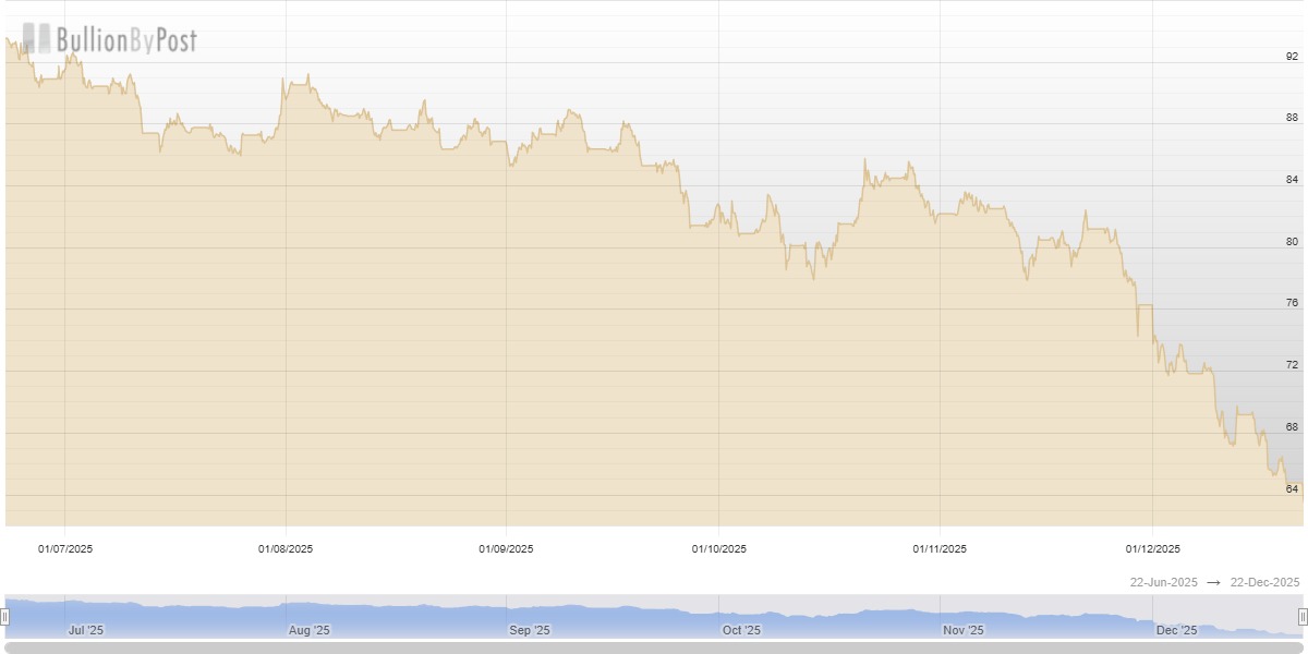 Il grafico allegato mostra chiaramente il crollo del rapporto Oro/Argento (Gold/Silver Ratio), passato da valori superiori a 90 a circa 64 negli ultimi sei mesi. Cosa significa? Che l’argento si sta apprezzando molto più velocemente dell’oro.
