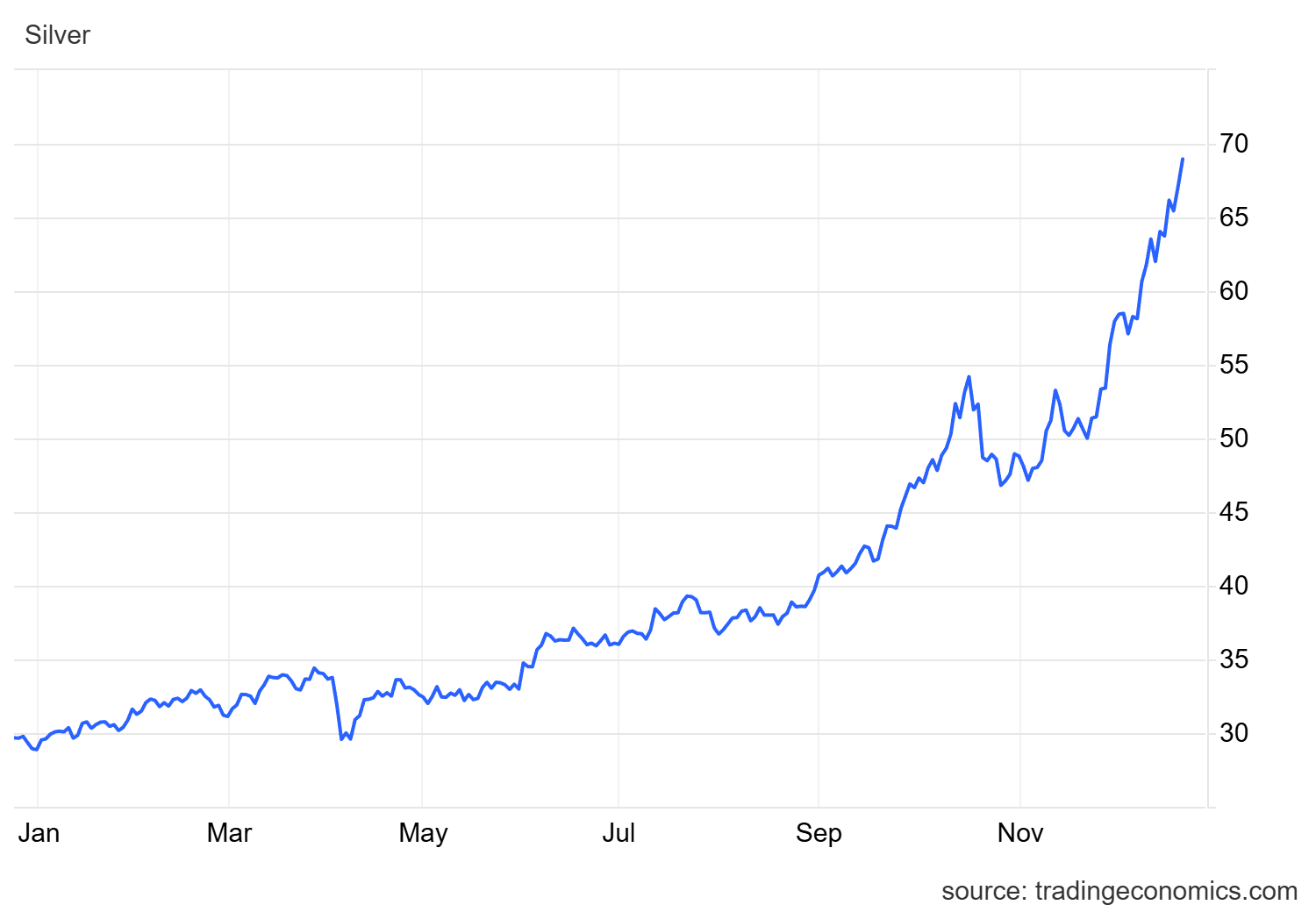 Tuttavia, se l’oro brilla, l’argento abbaglia. Il “parente povero” dei metalli preziosi ha messo a segno una performance mostruosa, superando i 69 dollari l’oncia e registrando un incredibile +140% da inizio anno.