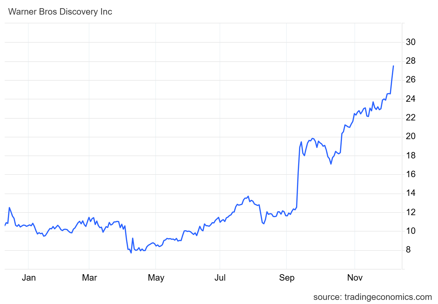 Lunedì il prezzo delle azioni della Warner Bros. Discovery è salito alle stelle di oltre il 7% e ormai stiamo sfiorando i 27 dollari per azione, mentre le azioni di Netflix sono scese di oltre il 2%. Ecco il grafico dei titoi WB da Tradingeconomics.