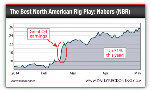 Sommare questi due elementi e non c’è da meravigliarsi se il nostro nome preferito nel settore degli impianti petroliferi, Nabors, è in crescita del 51% l’anno. Date un’occhiata: