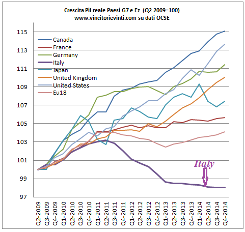 Eppure, assumere un atteggiamento più pragmatico dovrebbe essere caratteristica imprescindibile di ogni governante, soprattutto se questa performance (?) giunge dopo 20 trimestri di crescita negativa su 28 (7 anni) e dopo che l’italia ha perso almeno 330 miliardi di PIL, senza considerare tutti gli altri dati che sentenziano senza mezzi termini il livello di distruzione prodotta dalla crisi.Che esistano fattori che inducano a pensare ad un miglioramento dell’attività economica, è fuori da ogni dubbio. L’euro debole che favorisce le esportazioni, il prezzo del petrolio sceso del 50% e le manovre espansive della Bce, sono elementi che, gioco forza, dovranno necessariamente tradursi in qualche beneficio per l’Italia. E sicuramente sarà così. Ma questo potrebbe non bastare, soprattutto in ottica futura, quando le condizioni si faranno meno favorevoli.Per spiegarlo, partiamo con un semplice disegnino, che già basterebbe a smorzare i toni di esultanza, ampiamente infondati.Che si vede? Si vede una cosa molto semplice, ossia che dalla fine della recessione del 2009 (terminata nel II trim. 2009) tutte le economie si sono riprese: tutte, tranne l’Italia che nel frattempo ha conosciuto altri tre anni (abbondanti) di profonda recessione dalla quale stenta ancora a riemergere.Magari si potrà discutere sulla qualità della crescita di quelle economie che hanno superato la crisi del 2009, ma non sul fatto che siano cresciute.La ripresa intervenuta in quelle aree, per larga parte, ha consentito all’Italia di mantenersi a galla (ma anche no) per via delle esportazioni, che hanno avuto un ruolo fondamentale nella tenuta dell’Italia e che, in un certo qual modo, hanno compensato (almeno in parte) la caduta dei consumi e degli investimenti interni.A dire il vero, che l’Italia esprima livelli di crescita significativamente più ridotti rispetto ad altri paesi, non è un fatto nuovo e nemmeno recente.Prediamo un’altro grafico che conoscete già.Qui, l’orizzonte si allunga. fino al 1980.Si osserva che l’Italia, almeno fin dalla metà degli anni 90, ha registrato delle performance sempre più distanti da quelle delle altre economie (che sono cresciute), e la situazione si è aggravata significativamente dopo il 2000, diventando disperata dopo la recessione del 2009. Da ciò concludiamo che l’Italia, almeno negli ultimi 20 anni, ha mostrato una capacità di crescita assai limitata rispetto alle altre economie e la situazione è andata via via aggravandosi fino ad arrivare ai giorni nostri. Detta in altre parole, possiamo aggiungere che l’Italia, almeno negli ultimi due decenni abbondanti, ha dimostrato una cronica impossibilita/incapacità di crescita, che si è tradotta in livelli di Pil talvolta stagnanti e, negli ultimi anni, addirittura in forte diminuzione.Il grafico che segue ne esprime l’evidenza, aggravata dal debito pubblico in forte ascesa dal 2008, a fronte di livelli di crescita quasi stagnanti o addirittura negativi negli ultimi anni.Ora, dicevamo che la favorevole congiuntura internazionale degli ultimi anni ha offerto un prezioso contributo alle esportazioni, consentendo all’Italia di non precipitare del tutto. In una economia, come quella italiana, che cresce solo se al traino di altre economie (e sotto questo aspetto, la posizione di vulnerabilità dell’Italia si è ulteriormente aggravata) la domanda esterna costituisce elemento cruciale che, soprattutto negli ultimi anni, ha consentito di colmare almeno in parte la caduta dei consumi e degli investimenti privati.