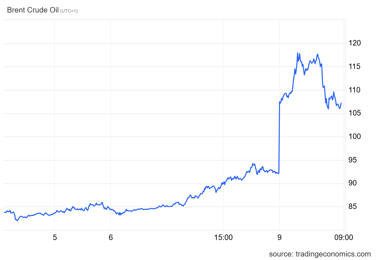 I mercati finanziari, come spesso accade, hanno reagito in modo schizofrenico. Il prezzo del greggio Brent ha registrato un’impennata iniziale di oltre il 25%, toccando i massimi dalla metà del 2022 a 115 dollari al barile, spinto anche dai tagli alle forniture di alcuni grandi produttori. Successivamente, proprio in scia alle indiscrezioni odierne sul possibile rilascio delle scorte strategiche, le quotazioni sono ripiegate intorno a quota 107 dollari.