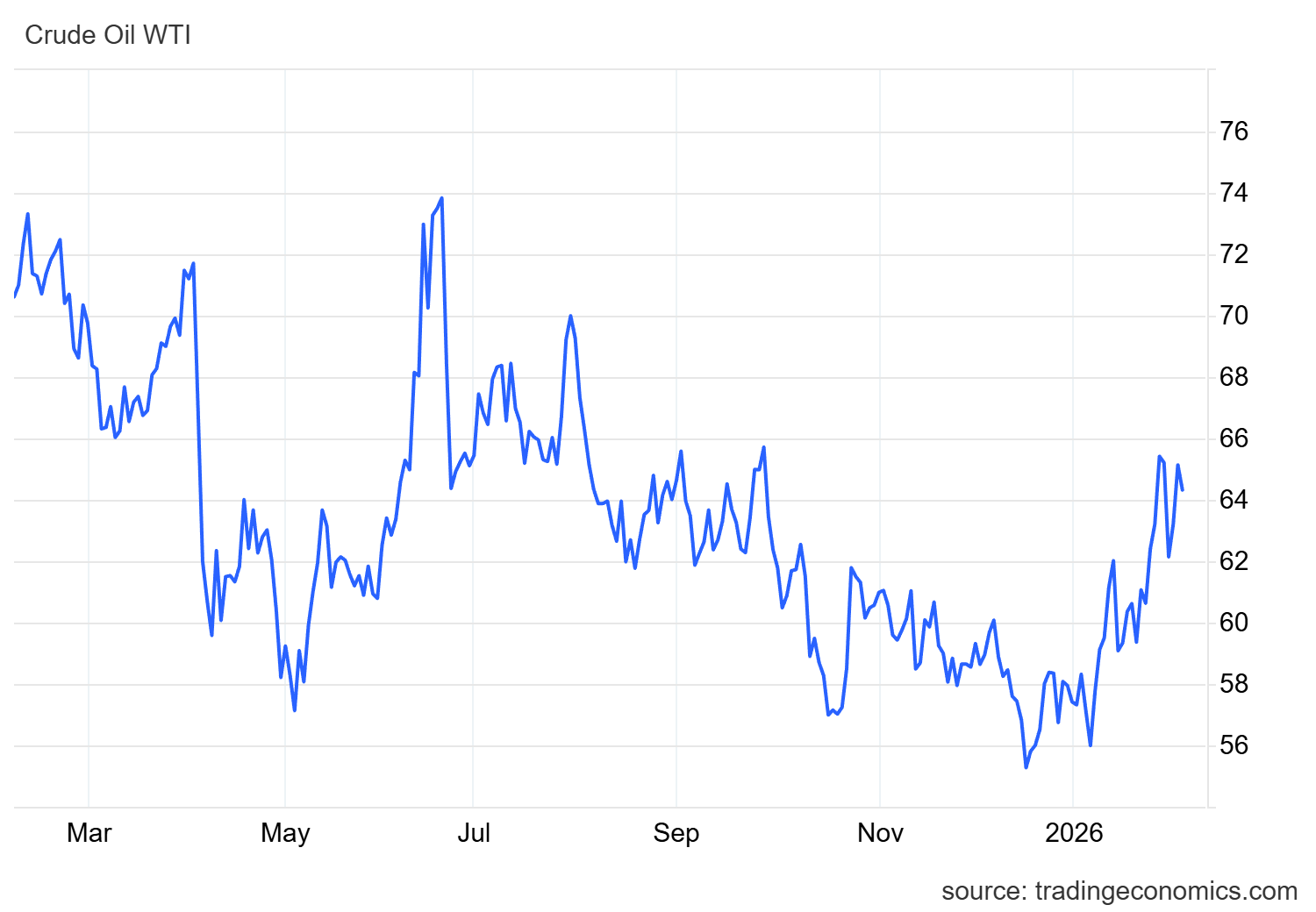 Se c’è una cosa che i mercati detestano più delle tasse, è l’incertezza. Eppure, nelle ultime 48 ore, il petrolio ha offerto agli operatori un vero e proprio manuale di volatilità schizofrenica. Dopo aver illuso i rialzisti con due giorni di guadagni, il West Texas Intermediate (WTI) ha fatto marcia indietro, scambiando oltre ai 64 dollari al barile durante la sessione asiatica di giovedì. Ecco il relativo grafico: