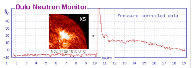 Il brillamento ha scagliato verso la Terra un “fucilata” di protoni energetici. Alcune di queste particelle sono così potenti da essere penetrate attraverso l’atmosfera fino al livello del suolo. “Questo è un evento molto significativo”, ha dichiarato il professor Clive Dyer dello Surrey Space Centre, sottolineando che i monitor di neutroni in tutto il mondo lo stanno rilevando.