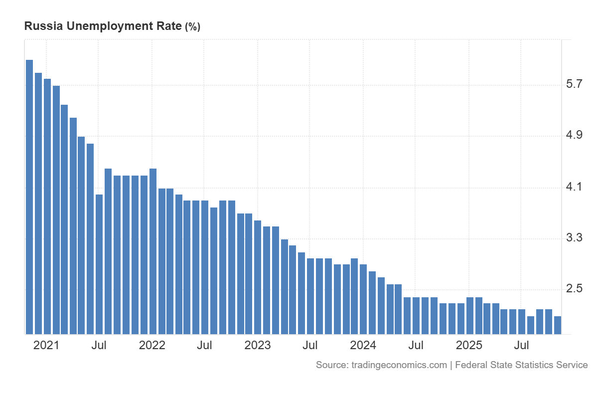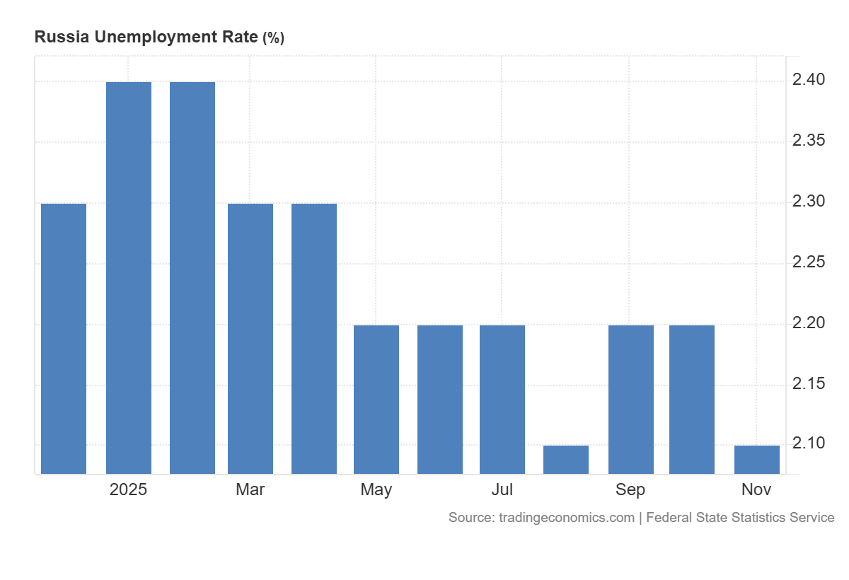 Mentre l’Europa si interroga sui propri tassi di crescita e sulle politiche monetarie, da Mosca arrivano dati che, letti superficialmente, farebbero l’invidia di qualsiasi cancelleria occidentale. La disoccupazione in Russia è crollata a un nuovo record storico: 2,1% a novembre 2025.