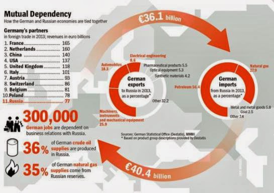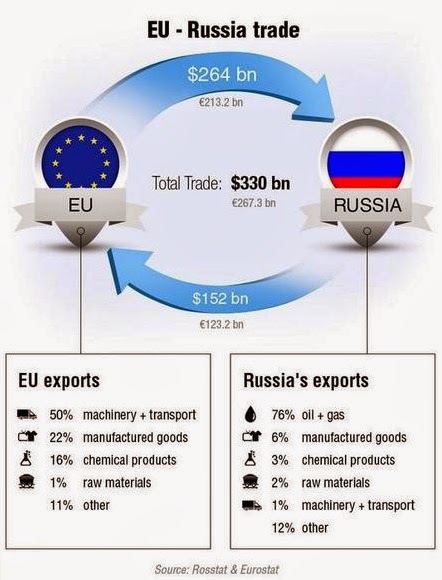 Via Zero Hedge: Con gli alti funzionari tedeschi che attendono il vertice dell’Unione Europea focalizzato a discutere su un secondo round di sanzioni contro la Russia (e avvertono che “devono evitare una spirale di sanzioni”), abbiamo pensato che vale la pena mostrare quanto l’Europa e la Russia siano reciprocamente dipendenti . Come Pater Tenebrarum nota su Acting-man.com, le seguenti infografiche mostrano che un botta-e-risposta di sanzioni tra UE e Russia potrebbe essere veramente un grande problema per l’Europa, e perché probabilmente i leader della UE stanno silenziosamente pregando che questa crisi semplicemente finisca.Scambio Commerciale tra UE e Russia (via RT)Scambio Commerciale tra Russia e Germania (via Der Spiegel)